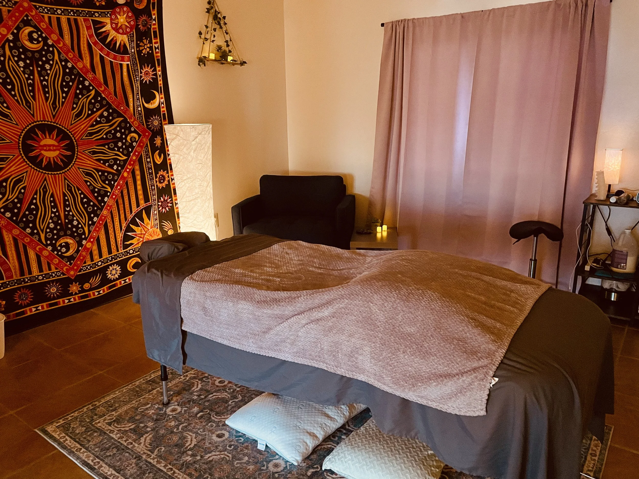 Lie on the massage table, underneath the provided sheet, which will cover your body entirely except for the part being massaged. Throughout your massage I will check in regarding pressure, but please let me know if you need a change in temperature, pressure, music, etc.
